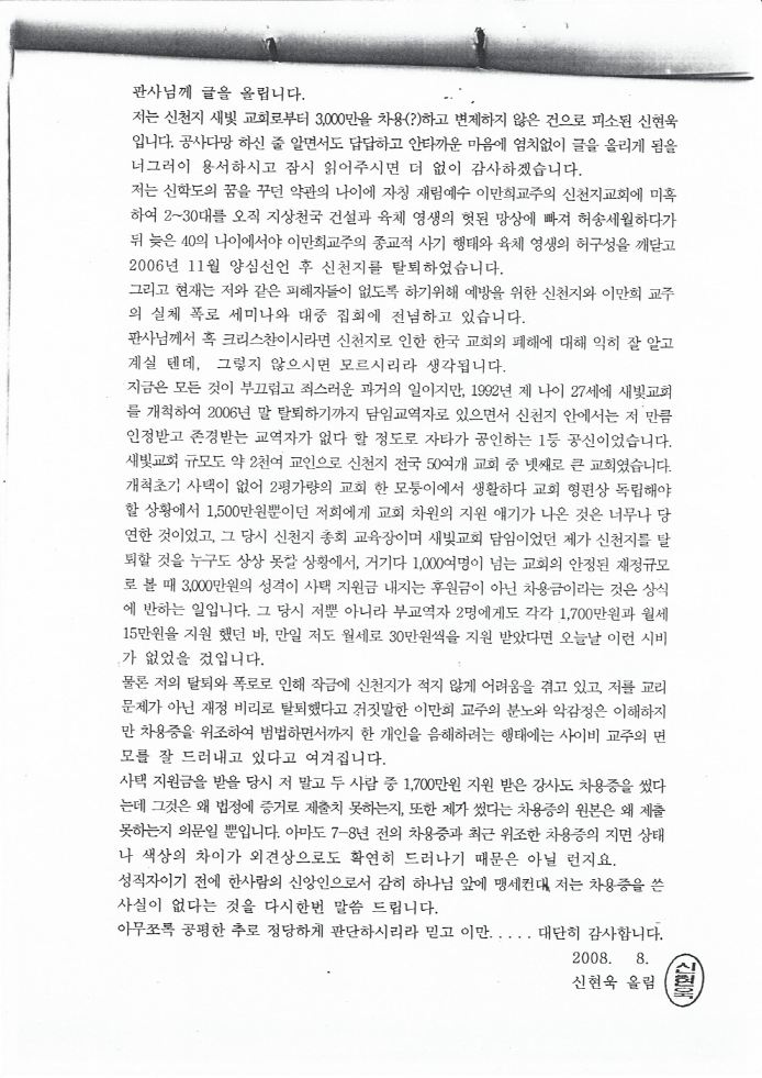 그리고 너무도 억울하다며 신현욱 목사님께서 판사님께 쓰신 탄원서..
