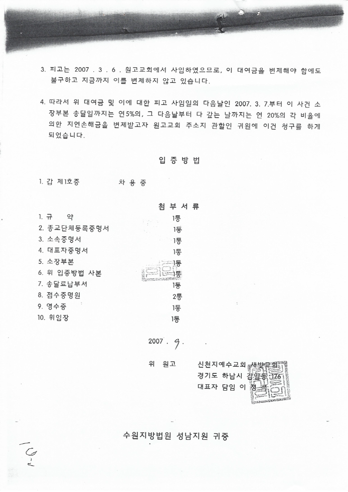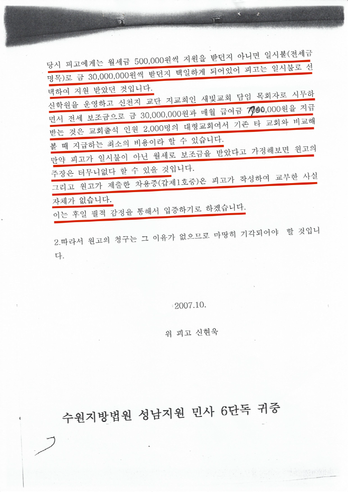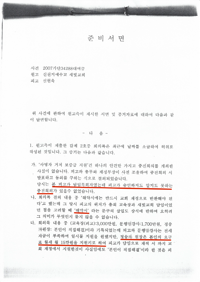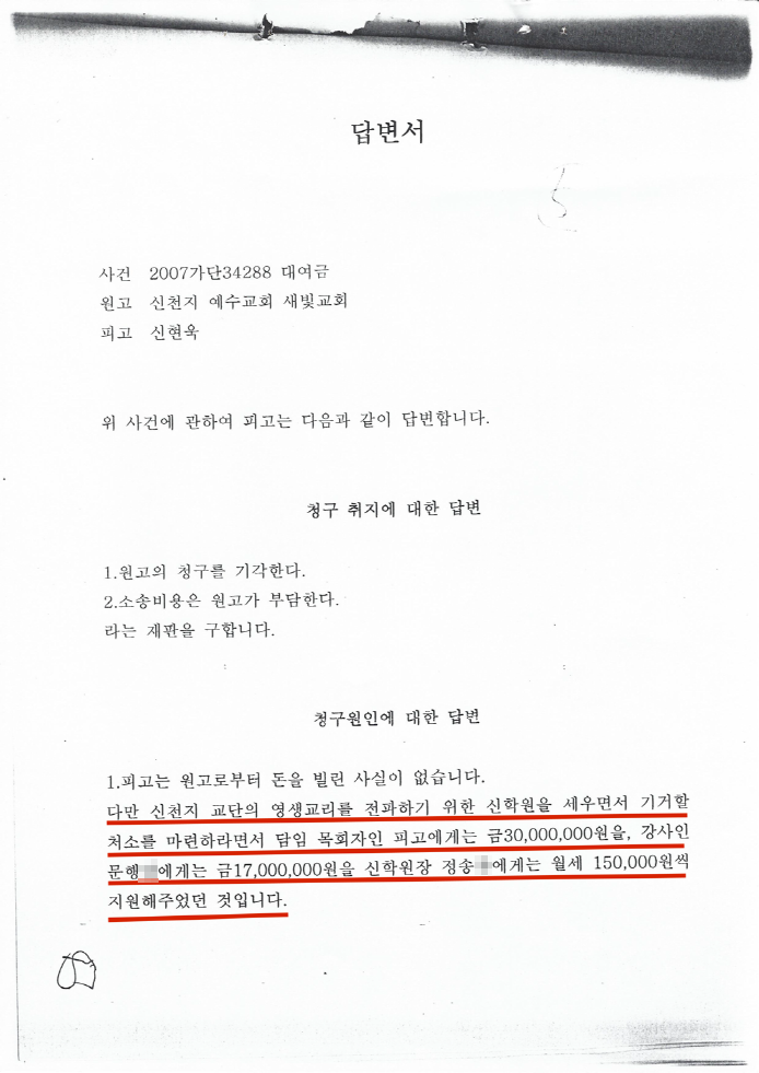 신현욱 목사님은 이 돈은 차용한 돈이 아니고 기거할 처소를 마련하라고 주었던 <지원금>이었다고 주장합니다.