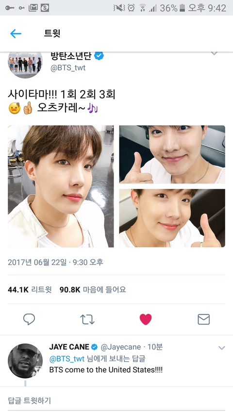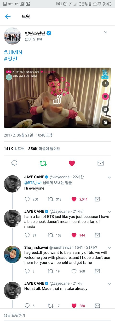 jaye cane이라고,,미국가수인거 같기는 하신데 잘 모르겠네,,,어쨨든 ㅇㅣ분도 계속 방탄 트윗에 댓글 남기시는데 귀여우심ㅋㅋㅋㅋㅌ역시 슈스소년단
