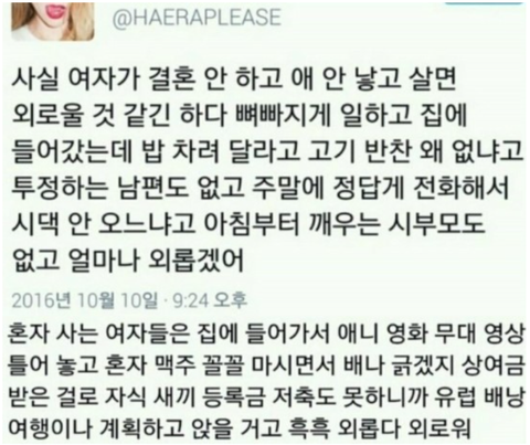 내 남편놈 조수미보고 결혼안했다고 애 못낳은다고 후려치기하는거 듣고 어이가 없었슴 미친놈아 나 같아도 조수미였음 결혼 안했다 미쳤다고 결혼해서 내 재능 깍아먹겠냐고 결혼하고 나면 한국 남자중에 외조 제대로 해주는 남자가 어딨다고 니 노후나 걱정해 그따구로 하면 설탕물도 감지덕지 되니까