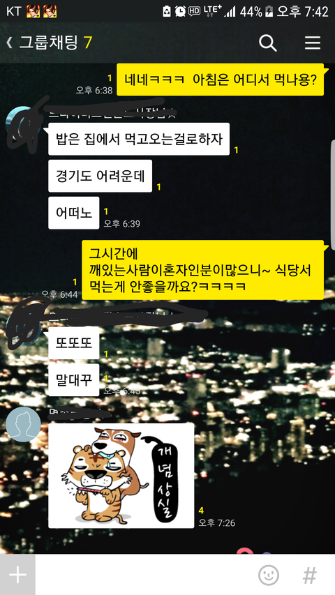 오늘 저녁 퇴근후 내일 경산쪽으로 일을가게되는데 아침을 어디서 먹어야하는 상황을 사장님께 여쭈어보는 상황에 회사형이 이상하게끼어드는 단톡방상황