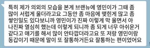 나 진짜 마음 굳게 먹었는데 이 말 들으니까 다시 속상해졌어... 생각해보면 우리도 이렇게 속상하고 마음아픈데 그 곳에서 누구보다 열심히 했을 영민이는 얼마나 속상했을까 생각하니까 또 마음이 아프더라... 우리 꼭 영민이 떠나지 않고 열심히 기다려서 영민이 잘 될수 있게 도와주자!!❤