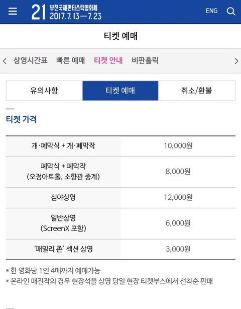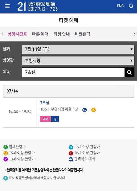 예매 http://m.bifan.kr 7호실 개막작 상영 7/13 19:30~21:04(예매7/3 14시) GV 7/14 14:00~15:34(예매7/5 14시)