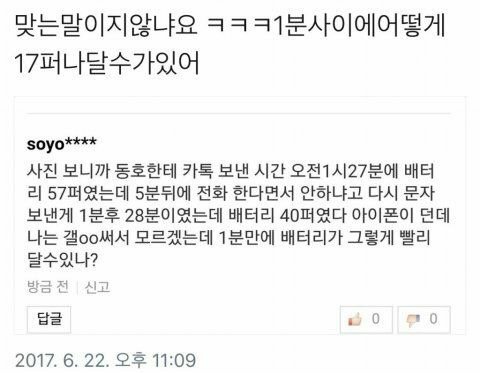 쓰니인 나도 아이폰유저임 (인증가능) 아이폰은 추우면 전원이 꺼지고 배터리가 확 닳을 수 있다고들 대부분 알고있음. 맞음 거짓은 아님 하지만 1분만에 17퍼가 닳아본적은 없음 특히나 여기선 더더욱 의심이감. 카톡조작이 아니냐는 얘기까지 들릴정도임.