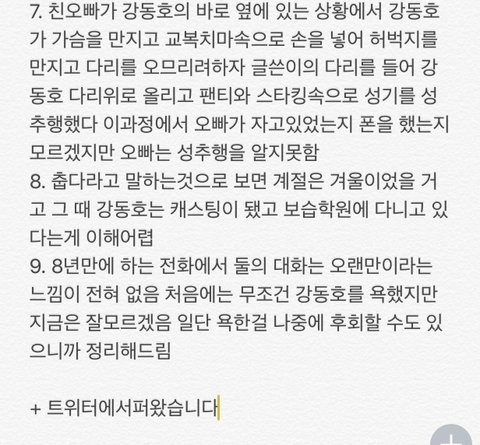 요즘 페북이나 스엔에스에서 하도 강동호 성추행성추행거리고 논란인거 많이봣음 나도첨엔 동호가 그럴거 같다고 생각햇는데 주작일거같다는 생각이 강해서 글을 쓰게됨. 2차공유상관없음 출처만 잘 밝혀준다면, 내 새벽잠 포기하고 쓰는거니까 하나하나 잘 읽어주길바람.