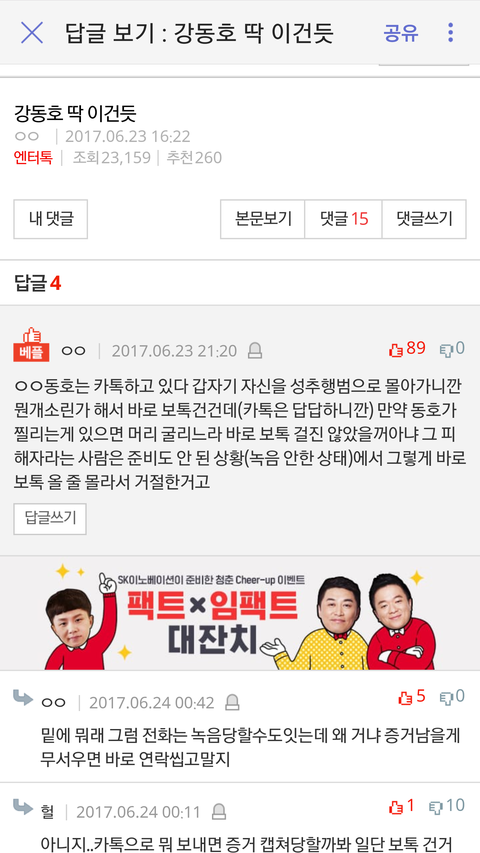 현재 타가수 3년째 파고있음 인증도가능 하지만 그럼에도 불구하고 이 글을 올리는이유는 지금 상황이 너무 강동호 성추행범맞네!! 쪽으로만 흘러가는것같아서 올려봄