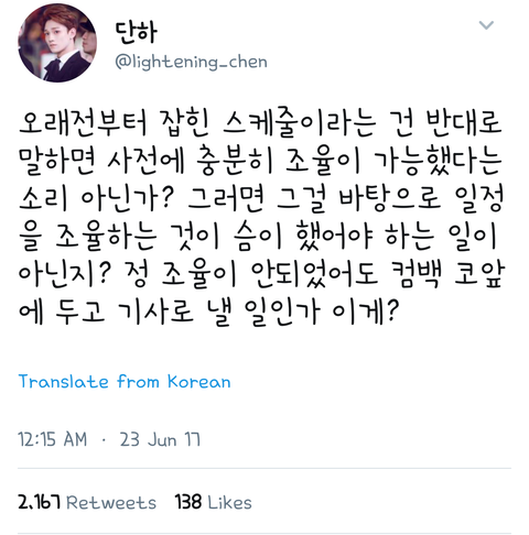 엑소 1년마다 정규 내는건 엑소 팬 아니여도 알듯ㅋㅋㅋㅋㅋ예전부터 6월달쯤에 앨범 낼거라는거 우리 팬들도 예상하는데 쟤라고 예상 못했을까? 그리고 준면이가 2월달부터 여름 컴백 얘기 꺼냈지만 준비는 훨씬 그 전부터 하고 있었겠지. 근데 뻔히 엑소 컴백 있는거 예상했을텐데 무리하게 스케줄 잡은게 누구? 그리고 스엠이 왜 조정하려고 노력 안했을거라고 생각하지?? 지들이 뭘 안다고ㅋㅋㅋ나는 이번에 엑소 컴백 이렇게 미뤄진거 9인조로 컴백시킬려고 노력하다가 미뤄진걸수도 있다는 생각 들던데
