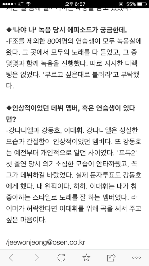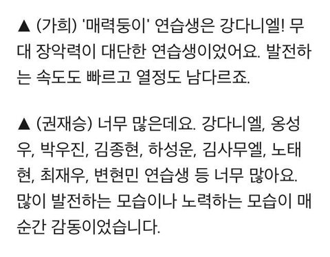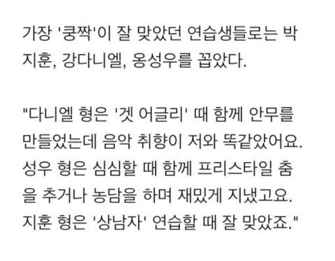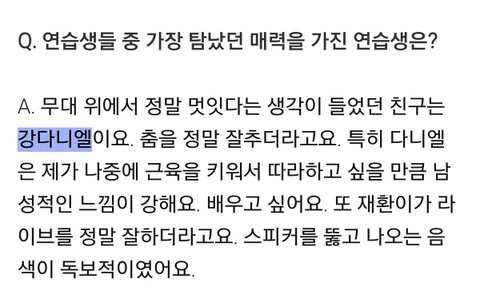 이거 말고 잡지에서 스탶이 언급한것도 있고 탈락한 연생들이 다니엘 성격 시원하고 털털하고 춤 잘 춘다고 말한 거 있는데 어디 있는지 모르겠다ㅋㅋㅋㅋ진짜 다니엘 이런 매력 때문에 내가 덕질 하나보다 얘를....