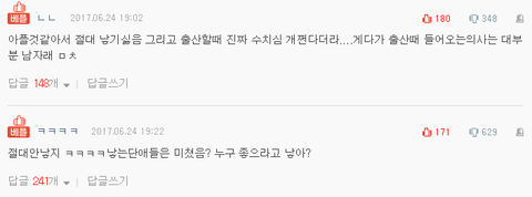 아플것같아서 절대 낳기싫음 그리고 출산할때 진짜 수치심 개쩐다더라....게다가 출산때 들어오는의사는 대부분 남자래 ㅁㅊ