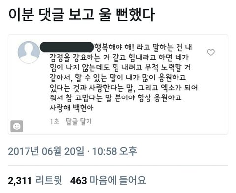 헐 저 말 백번이고 만번이고 와닿는다 내 무의식중에 저런 감정이 있었는지 모르겠지만 항상 애들 인별댓글에 난 세훈이를 백현이를 찬열이를 늘 항상 응원하고있다고 댓글달고 항상 일상 공유해주면서 우리걱정해줘서 고맙다고 댓글달았는데 딱 저마음이였어