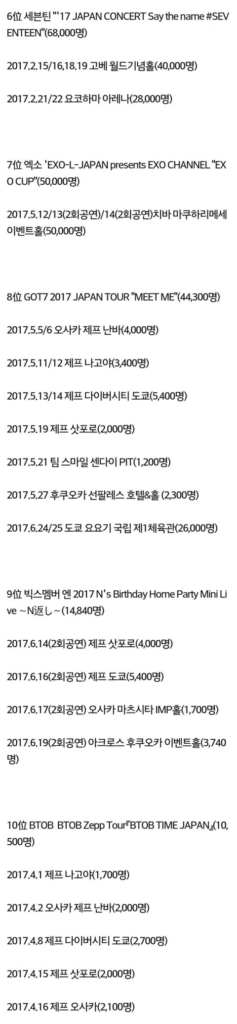 2017년 상반기 KPOP가수 일본 LIVE공연 관객동원 TOP10.JPG