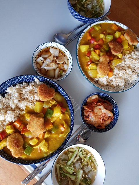 닭가슴살과 야채를 듬뿍 넣은 카레만들어서 냉동실 뒤져보니깐 연어너겟 있길래 너겟 기름 살짝둘러 구워서 맛있게 먹었어요