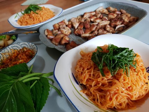 비빔면과 삼겹살의 조화는 항상 진리죠?