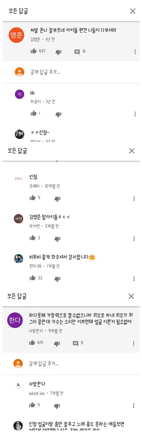 멤버별 개인 커버 동영상에 달린