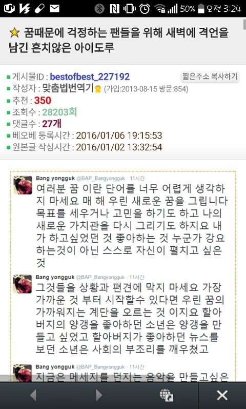 나 입덕한지 꽤 된 베이빈데 지금 판 처음 들어왔어. 근데 원래 이런 곳이야? 팬들이 직접 듣보라고 하고 아무것도 밝혀진게 없는데 일단 욕하고. 티저만 보면 용국이가 잘못한거긴 한데 그거가지고 용국이 인성까지 매도하는거 좀 아닌것 같아. 그리고 사실 난 이번 티저 전까지 용국이 팬이라는게 너무 자랑스러웠거든. 물론 지금도 그래. 그런김에 용국이 인성 글 하나 투척할게