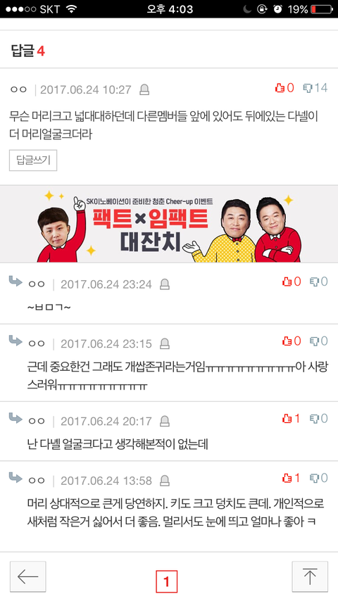 돌덕질 안해본건 죄가 아니고 연령대 높은 팬들이 많은건 죄가 아닌데 그 팬들이 눈치없이 행동하면 강다니엘 팬덤 전체가 싸잡혀서 욕먹고 강다니엘까지 욕먹을수있는거야 아이돌 팬덤이란 원래 그런거잖아 그러니까 나이로 고나리 하지 말고 쓸데없는글 싸지르지 말자