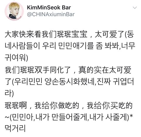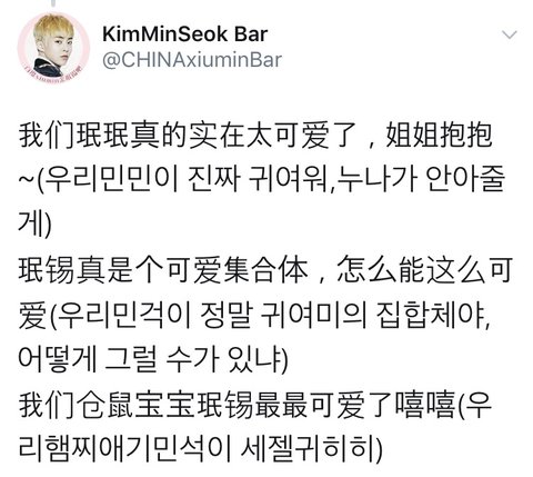 민석바에서 요즘 매일 올려주시는 중국어로 민석앓기 공부인데 웨이보 하시는 웅녀들께 매우 유용할것 같슈밍>.<