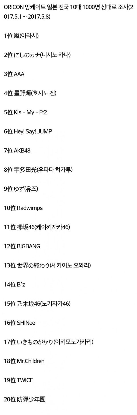 일본 10대,20대 선호도인데 엑소는 들지도 못함