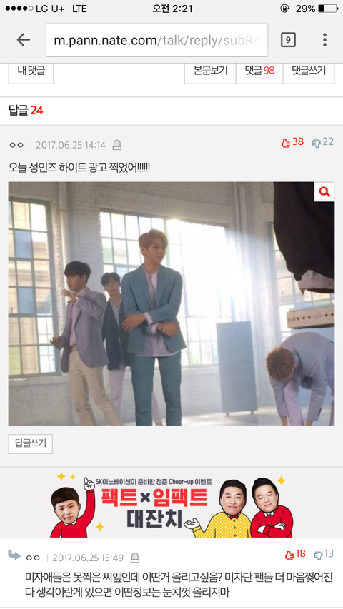 ㅎㅎ와 뭐여 이렇겜까지 많이읽어줄지는 꿈에도몰랐다 애들아 참고로 나 팬 맞어 ~ 이번에 이마넌도 낼꺼야 ㅠ 왜 팬코취급해 ㅠ 이게 실상이잖아 내가본것만으로도 몇개가 되는디 .. 아닌척마 글고 니네는 안그랬다 억울하다 싶음 걍 곱게 지나가 ;; 이런애들한테 쓴거지 니들한테 쓴거아님 ㅋㅋㅋㅋㅋㅋ 내가 다그렇다했어 ㅠ?? 맞춤법 고쳤엉 지적 고마워 >_< 난 분열조장이 아니고 저렇게 생각하는 애들을 욕한거야 ; 저런댓글에 성인단 욕하는애들 없었어 ;; 그저 올린애를 욕했지 애초에 팬끼리 싸우라고 올ㄹ린글이 아닌데 ㅠ