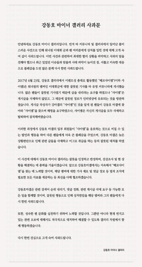 ㅇㄷㅎ 군이 받았을 상처와 팬 분들이 받았을 상처를 저희가 대신 받을 순 없겠지만 이제부터 이런 일이 절대 일어나지 않도록 노력하겠습니다. 또한 각각의 게시글에 올라온 개별 사과글 댓글의 "억울함의 호소"가 팬여러분의 심기를 불편하게 한 점 또한 사과합니다.