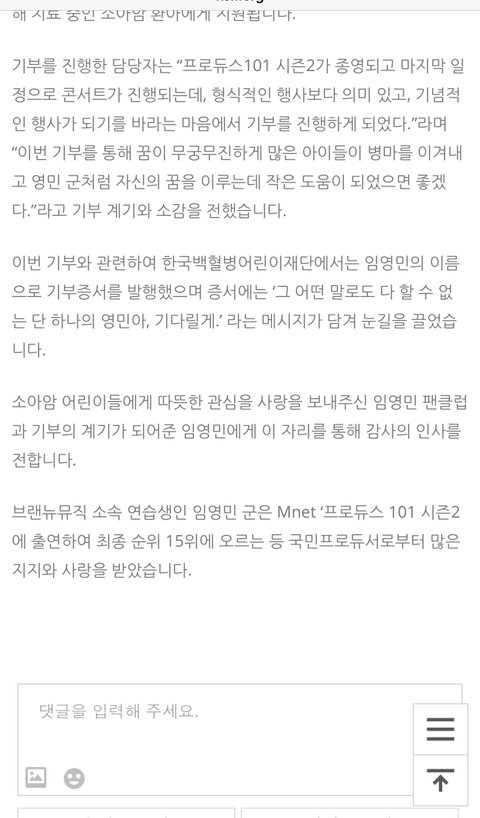 우연히 본 한국 어린이 백혈병 재단에 올라온 게시물 하나.....팬들을 보니 영민이가 어떤 아이인줄 알겠네요~~~아직 연습생이고 팬들도 적어 홍보 서포트하기도 힘들텐데...기부까지 하다니.....맘이 예쁘고 착한 팬들이네요~~~