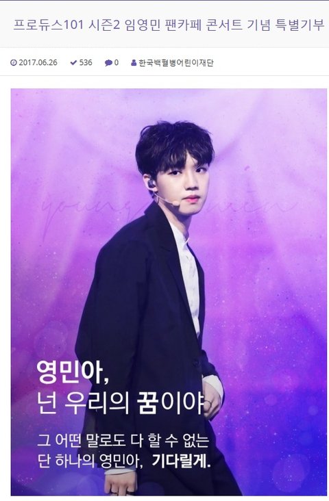 프로듀스101 시즌2 임영민 팬카페(다음/네이버)에서 7월 1일, 프로듀스101 시즌2 FINALE CONCE 개최를 기념하여 한국백혈병어린이재단에 후원금 101만 원을 전달했습니다.