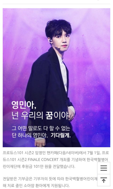 우연히 본 한국 어린이 백혈병 재단에 올라온 게시물 하나.....팬들을 보니 영민이가 어떤 아이인줄 알겠네요~~~아직 연습생이고 팬들도 적어 홍보 서포트하기도 힘들텐데...기부까지 하다니.....맘이 예쁘고 착한 팬들이네요~~~