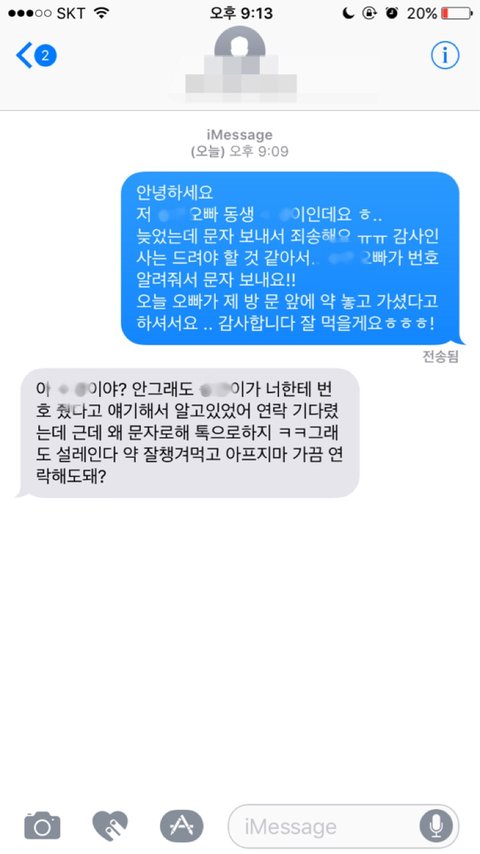 폰으로 뭘 하더니 "야 카톡으로 짝남 번호보냄 문자로 말해"