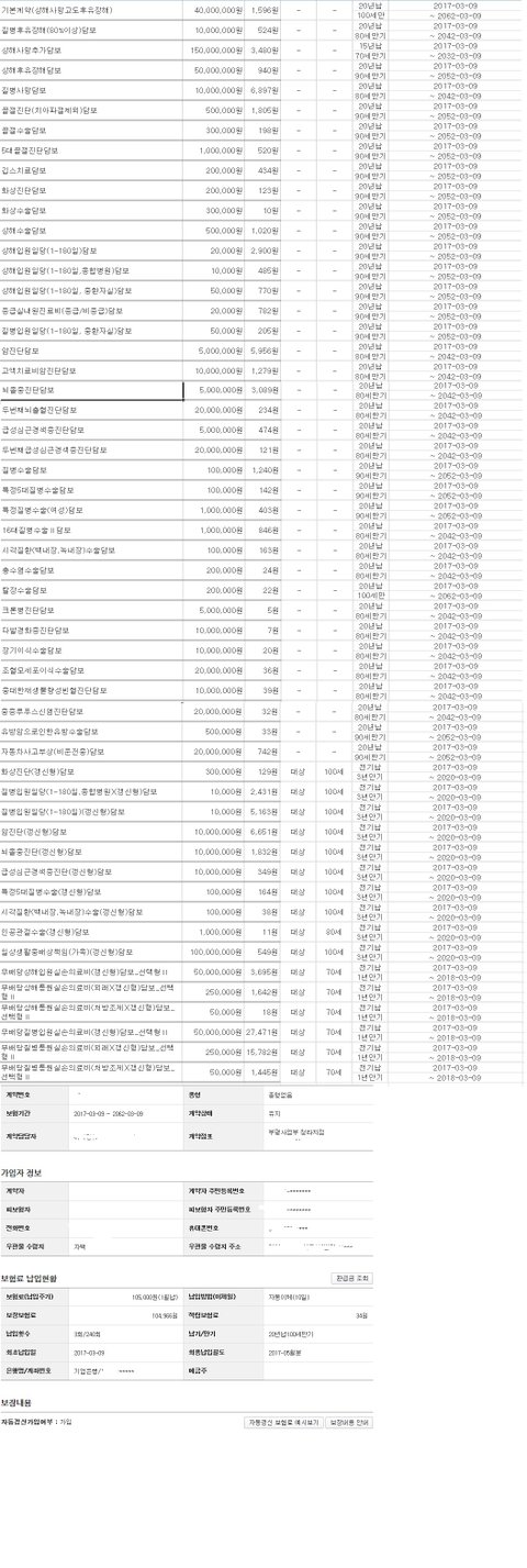 여성 62년생 직업:주부 월보험료105000원 20년만기/100세보장 만기환급x