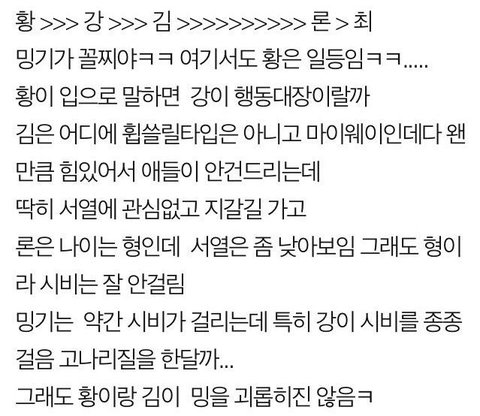 나는 민기가 서열 최고라는것보단 동호가 꼴지인게 더 와닿아 ㅋㅋㅋㅋ그냥 얜 모든 영상에서 그래 ㅋㅋㅋ