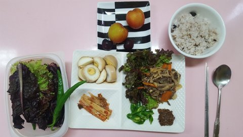 서리태콩밥, 소고기야채볶음, 청량고추, 상추쌈,