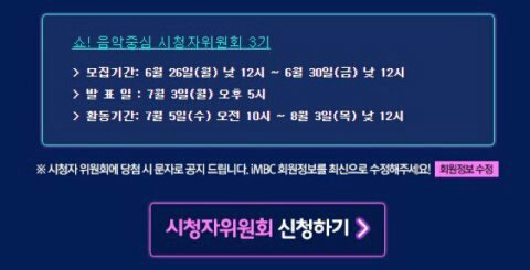 ✔30일 금요일 낮 12시까지 신청가능함!! http://www.imbc.com/broad/tv/ent/musiccore/recruit/ 1위점수에 들어가는거야 꼭 신청하고 시청자위원회 점수 만 점 주자