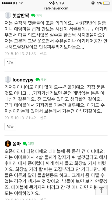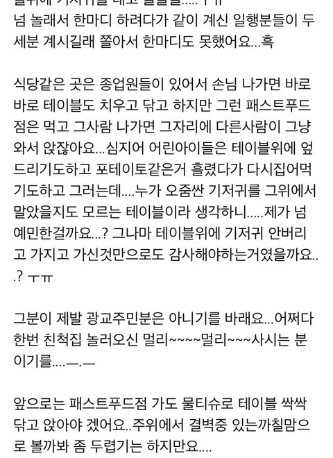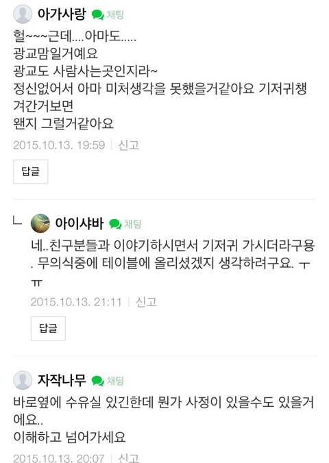기저귀야 뭐 수도없이 봤고... 애들 소파에서 신발신고 뛰는데 가만히 두시는건 당연하고 카페에서 소리지르고 뛰어다니고ㅋㅋㅋ