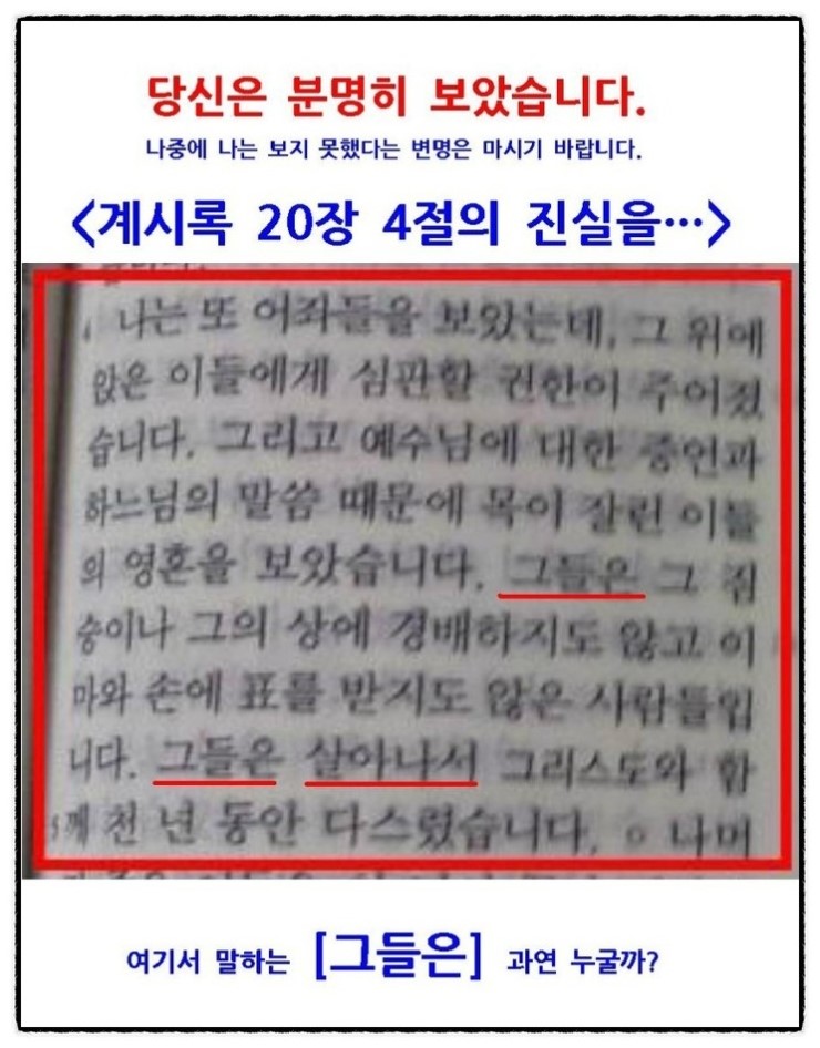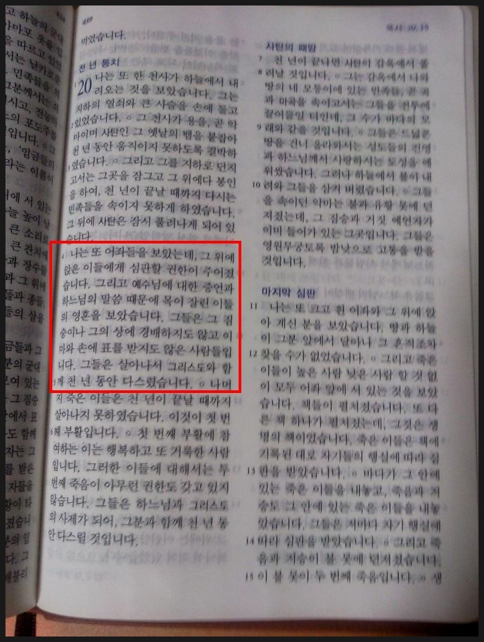 또 내가 보좌들을 보니 거기 앉은 자들이 있어 심판하는 권세를 받았더라 또 내가 보니 예수의 증거와 하나님의 말씀을 인하여 목 베임을 받은 자의 영혼들과 또 짐승과 그의 우상에게 경배하지도 아니하고 이마와 손에 그의 표를 받지도 아니한 자들이 살아서 그리스도로 더불어 천년 동안 왕노릇 하니개역개정