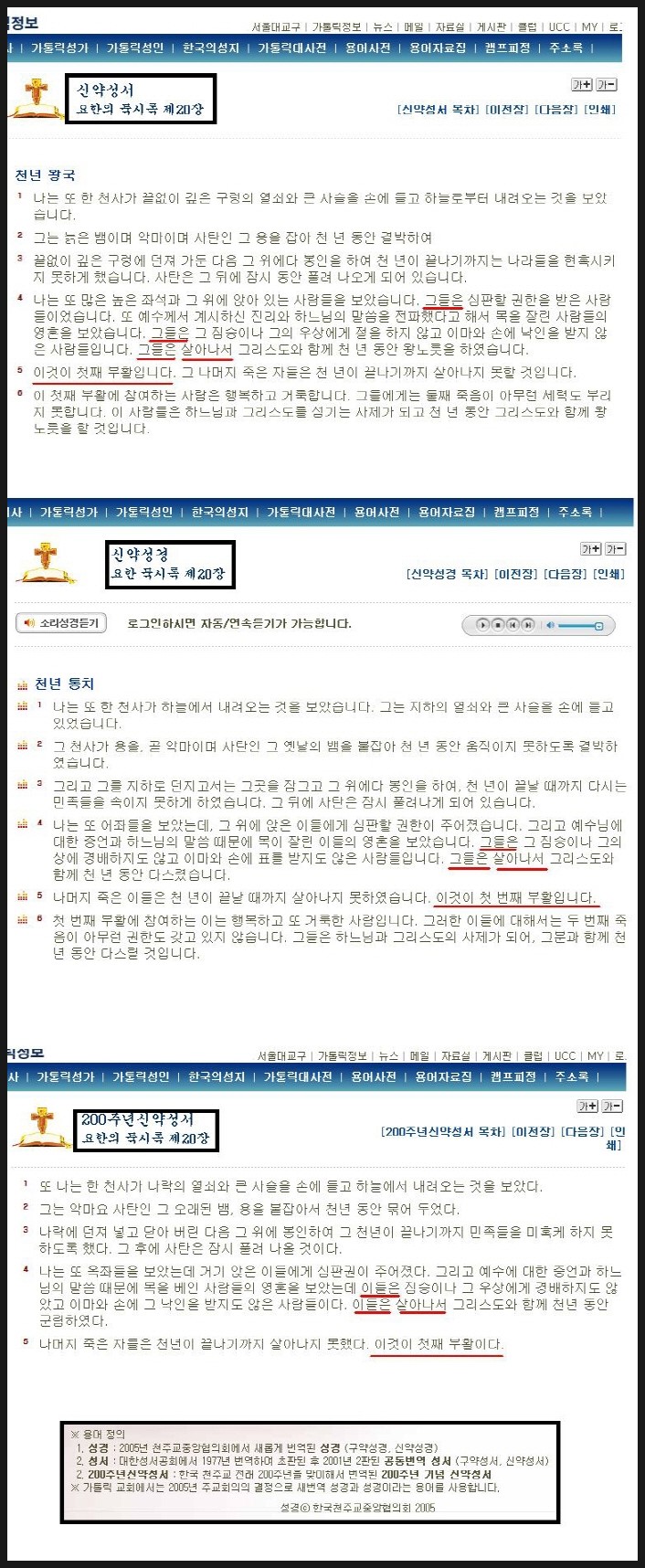 또 내가 보좌들을 보니 거기에 앉은 자들이 있어 심판하는 권세를 받았더라 또 내가 보니 예수를 증언함과 하나님의 말씀 때문에 목 베임을 당한 자들의 영혼들과 또 짐승과 그의 우상에게 경배하지 아니하고 그들의 이마와 손에 그의 표를 받지 아니한 자들이 살아서 그리스도와 더불어 천 년 동안 왕 노릇 하니공동번역