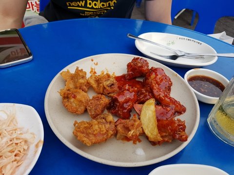 그냥 남편이랑 오랜만에 외식이구 그전에 회두 먹엇구 그냥 두어개 먹구 소주 1병 생맥 1잔 먹구 치킨나오구 30분 됐나?일어났어요..ㅎㅎ원래 남편이랑 치킨집가면서 남으면 싸가자 라는 생각으로 갔는데..ㅎㅎ