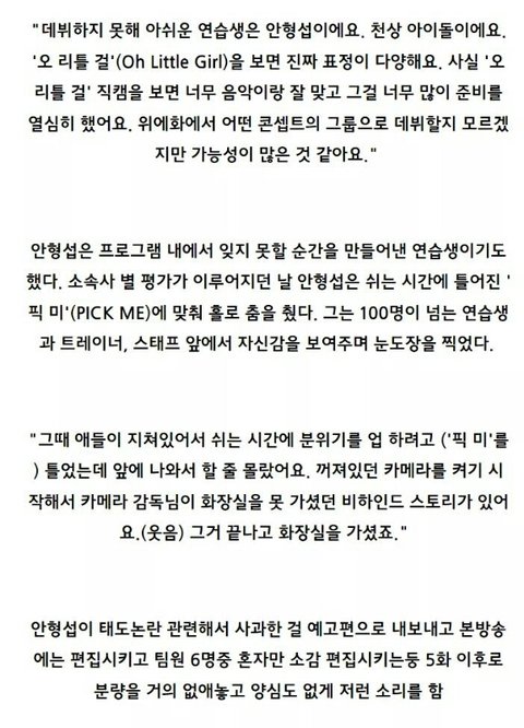 지가 편집으로 애 하나 골로 보낼때는 언제고 이제와서 저렇게 입터냐ㅉㅉ 그 입삐죽 사건만 아니었어도 형섭이는 데뷔 안정권이었고 그 후에 분량만 줬어도 충분히 반등해서 데뷔했을거다 얘 1픽 조사한거랑 직캠 화력만 봐도 코어 엄청 쎈 앤데