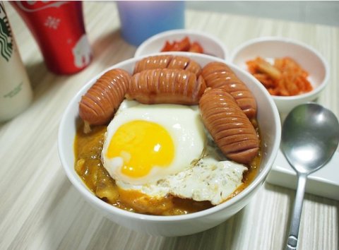 자취생의 친구 카레도 먹습니다. 그냥 먹으면 아쉬우니까 계란 반숙 하나랑 제가 좋아하는 소세지를 곁들여 먹습니다.