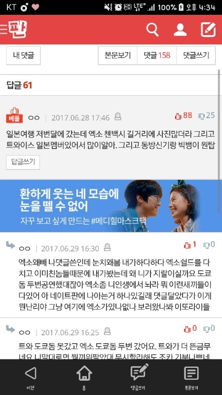베플에쓴애가 일본갔다가 첸백시 봤다고 댓글달았다가 밑에 엑소보면 발작하눈애들이 조카 엑소빼라끼팔하지말라 이지랄해서 얘조카빡침ㅌㅋㅋㅋㅋㅋㅋㅋㅋㅋㅋㅋㅋ