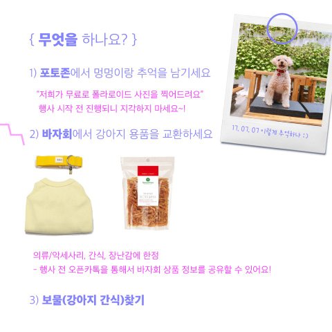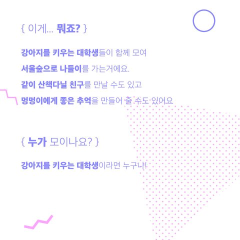 안녕하세요 서울숲에서 강아지와 함께 나들이하는 모임을 기획중인 대학생 기획단입니다!20대 또래 친구 및 대학생 견주분들 함께 모여서 서울숲에서 함께 바자회도 해보고 함께 이야기도 하는 모임이에요!참가비 무료로 진행되며반려견을 위한 건강한 수제간식 '개밥그릇'에서 참가자 전원에게 수제간식샘플세트를 제공합니다!