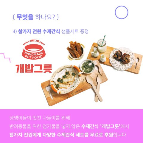 안녕하세요 서울숲에서 강아지와 함께 나들이하는 모임을 기획중인 대학생 기획단입니다!20대 또래 친구 및 대학생 견주분들 함께 모여서 서울숲에서 함께 바자회도 해보고 함께 이야기도 하는 모임이에요!참가비 무료로 진행되며반려견을 위한 건강한 수제간식 '개밥그릇'에서 참가자 전원에게 수제간식샘플세트를 제공합니다!