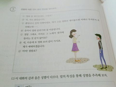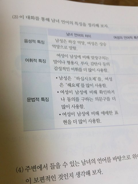 만약 학생들이 지역별언어차이를 배웠을때 그래서 지역별로 소통이 어려운상황이 있는구나라고 받아들이고 세대별언어차이를 배웠을때 그래서 할아버지의 말씀이 어렵게 느껴지는구나 라고 받아들인다면 남녀간언어차이를 배웠을땐 아 여자는 저렇게말하는구나 하고 받아들일거야