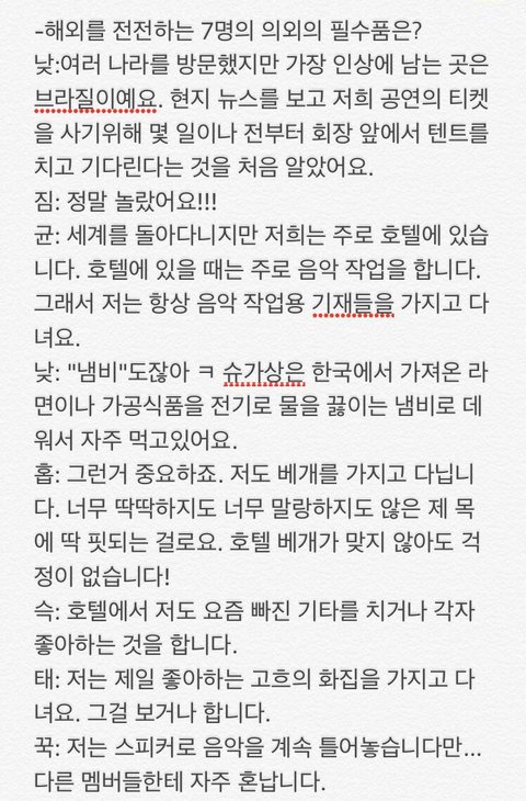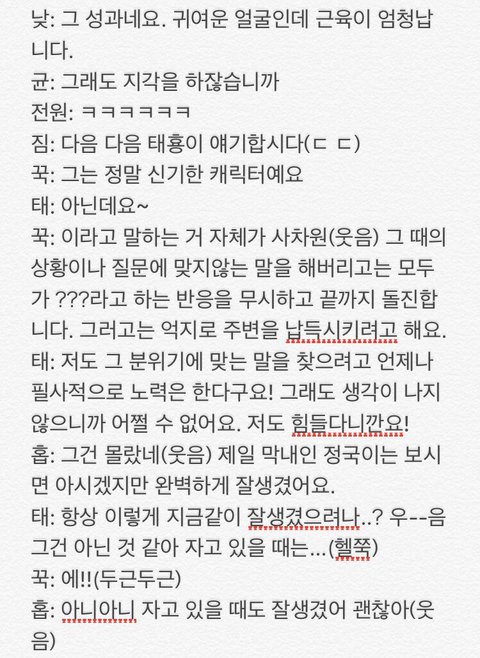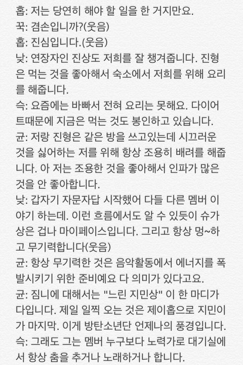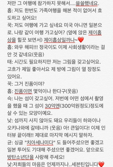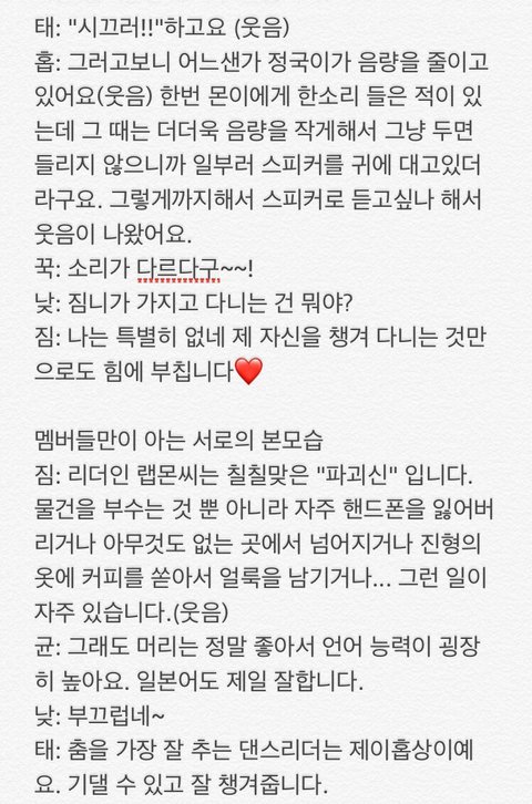 저는 없어요. 모든 멤버들, 안 그래도 너무 잘 알고 있는데 바뀌어서까지 알고싶은것이 없달까.특히 지.민씨와 정.국이의 비밀은 전부 알고 있어요, 그쵸,그쵸?