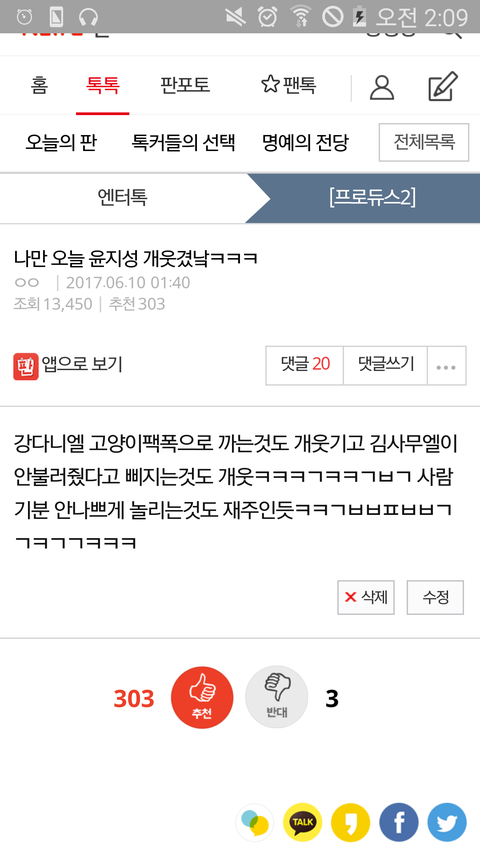 내가 윤지성 데뷔조에서 좀 순위떨어졌을때 이번화 윤지성 하드캐리라고 고양이 4마리랑 운동회 mc랑 김사무엘한테 삐진거 개웃기다고 올렸을때는 추천수 300에 반대 밖에 없었는데 지금 데뷔하고나서 고양이 사건 언급 경솔하다고 까고.. 뭐야 진짜ㅠㅠ
