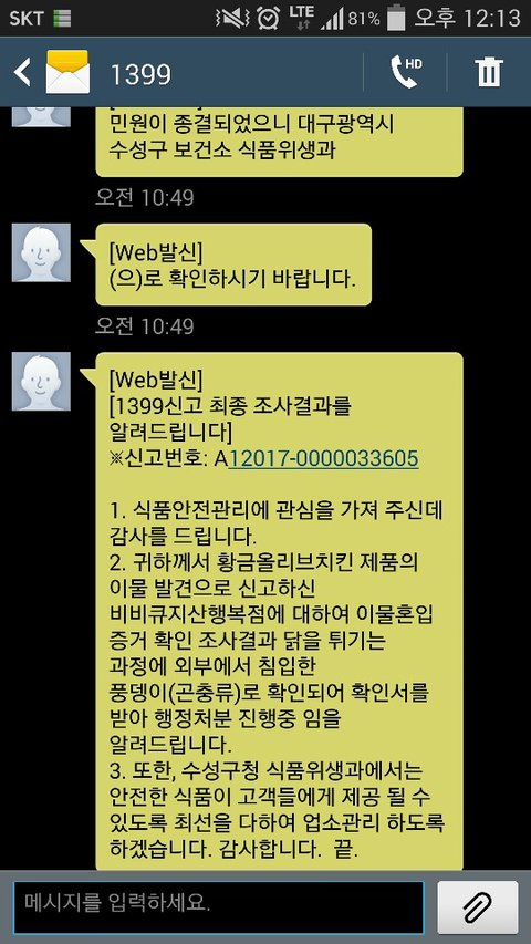 가맹점과 다시 연락을하니 이제는 제가 벌레를 잡아 고의로 한일이 아니냐 하며 되려 손해배상청구를 한다고 했습니다 전 식약청에 벌레가 붙어있는 제품을 식품위생과에 제출하고 불량식품 신고를 하였고 결과는 조리중 들어간것이라 판명났습니다 진정한 사과를 원했지만 해당가맹점에서는 연락이와서 결과는 그렇게 나왔더라도 고의인지 아닌지는 확실히 모르죠 라는 태도로 일관하였고 벌레있는 치킨을 직원이 확인했고 자신은 못보았다고 책임을 회피하고 있습니다 아직도 제대로된 사과를 받지못했습니다