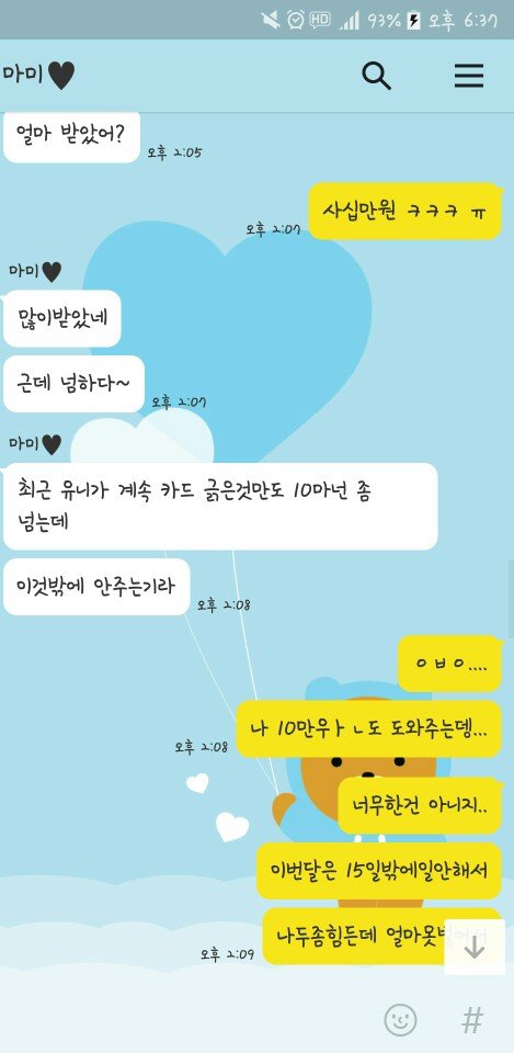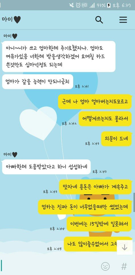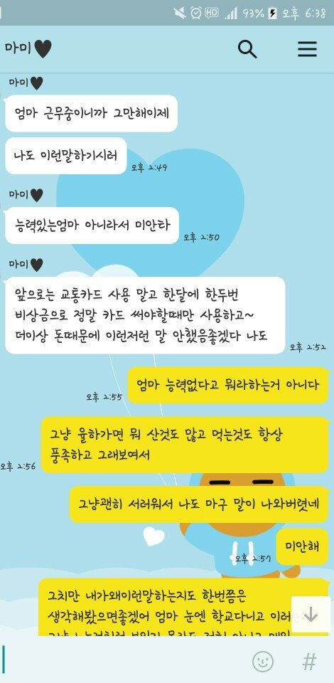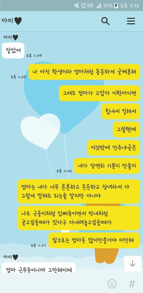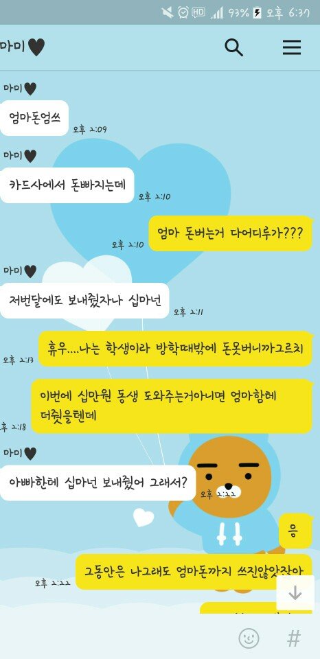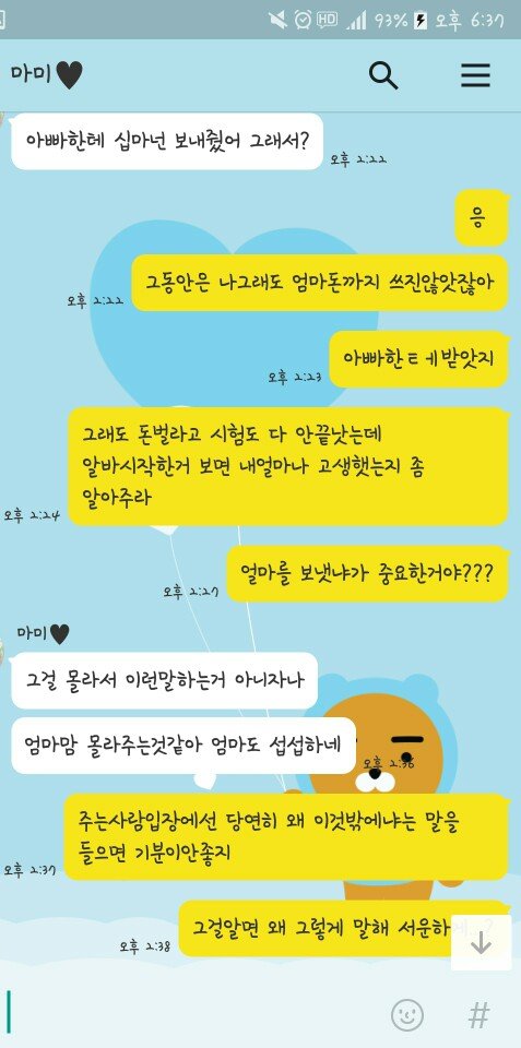 어머니가 나쁜분은 아니세요 착하고 그러셔서 더 말하기가 힘들어요... 차라리 못된엄마처럼 그랬다면 저도 연끊고 알아서 사시던지 할수도 있었는데 그게 아니라서 거기다가 제가 모질지를 못해서 휴......지금도 이런 수준인데 앞으로 제가 돈을 벌면 얼마나 더 심해질지 잘 모르겠네요. 용돈 챙겨드려도 더더더 바라실거같아요. 위의 카톡만 보면 저희엄마 되게 힘들어 보이잖아요. 제 교통비까지 내줄 형편 안되는것처럼... 근데 그정도까지 아니고 어머니만 지출 줄이시고 보태면 우리아빠 그렇게까지 힘들게 일안해도 돼요. 저도 그렇고요. 근데 이미 이혼도 했고 어머니가 돈 보탤 이유는 없어요. 그렇지만 저희 아버지 동생 대학갈때까지만이라도 어머니한테 돈 들어가는거 다 내주신다는데... 만약 저였다면은 동생 대학갈때까지만이라도 얼마 버는지 다 공개하고 도와줬을 거 같아요. 어머니 얼마버는지는 저도 모르고 아빠도 몰라요. 어디다가 쓰는지도 모르고요. 어머니의 이런 이기적인 행동 때문에 저희 가족은 점점 더 지쳐만 가요. 어머니는 비운의 여주인공처럼 생각하시겠죠. 저는 또 불효녀 되있겠구요. 이제 이런 것들이 지긋지긋하고 화가 나네요. 알바 가는 데 드는 교통비... 그것도 이젠 제 돈으로 내야겠네요. 나중에 독립하고 용돈 끊으면 저도 어머니한테 그렇게 잘해드리진 못할 것 같아요. 그냥 받기도 싫고 주기도 싫어져요. 제가 이상한건가요? 얼른 돈을 많이 벌고 싶어요. 돈얘기로 그만 구차해지고 싶어서요...