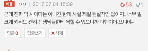 근데 진짜 막 사이다는 아니긴 한데 사실 제일 현실적인 답이지.. 너무 일 크게 키워도 괜히 선생님들한테 찍힐 수 있으니까 다행이야 쓰니야~
