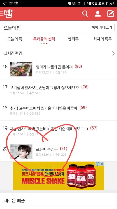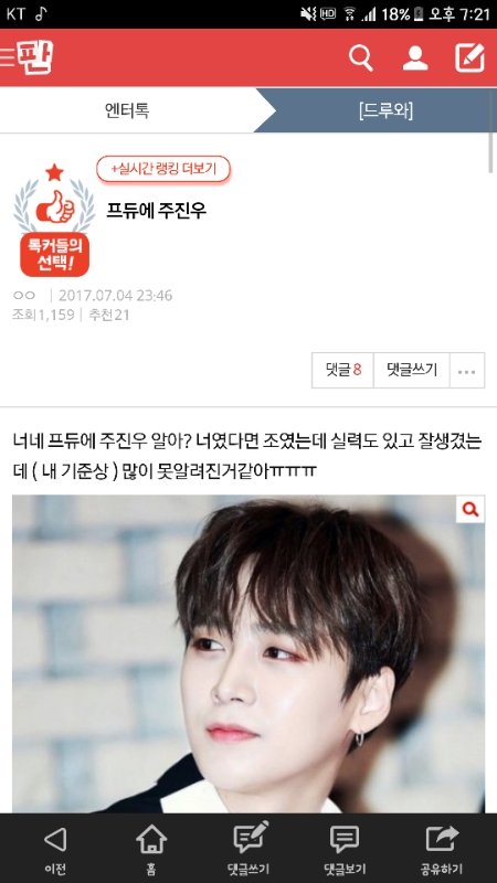 헐 나 톡커들의 선택 될지 몰랐다,, 주진우 그냥 적은사람도 좋으니 기억해줬으면 좋겠다고 생각돼서 올렸는데 추천수 20넘을지몰랐고... 주진우 mmo 소속이야ㅠㅠ 그리고 보컬이고ㅠㅠㅠ 25살이고ㅠㅜ 두번째 순위발표식때 떨어졌어ㅠㅠㅠㅠㅠ 꼭 기억해줘ㅠㅜㅠ!!
