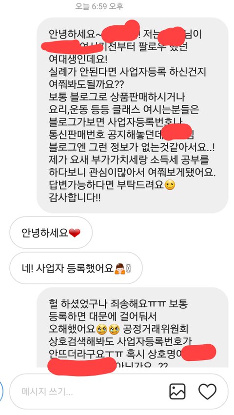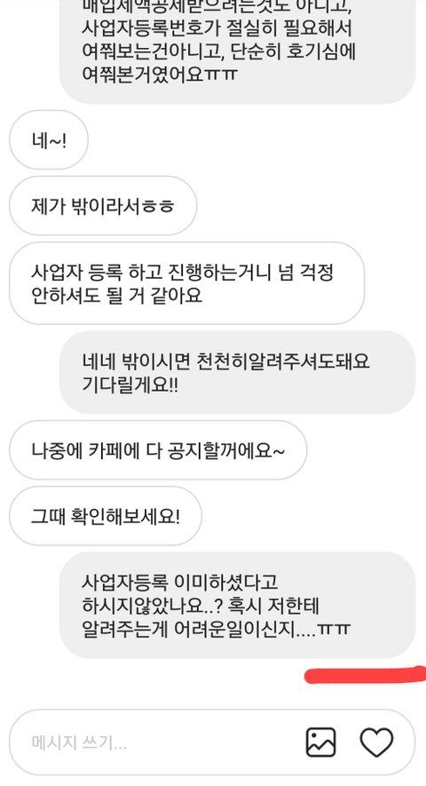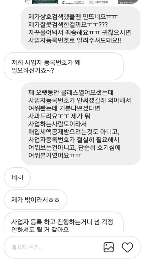 아무리찾아봐도 사업자등록번호가 없길래 의아해서 메세지 드렸더니 이렇게 답변이왔네요.