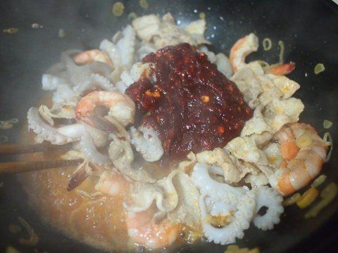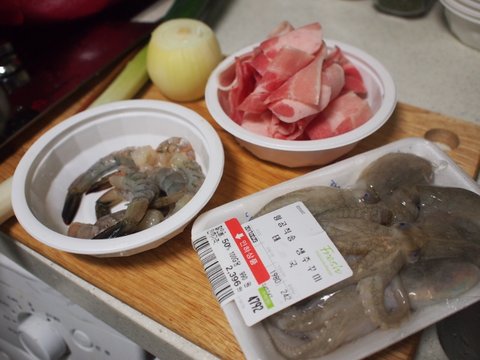 재료는 할인 쭈꾸미, 냉동실 쳐박혀있던 새우, 대패, 양파, 파, 마늘, 기타양념.